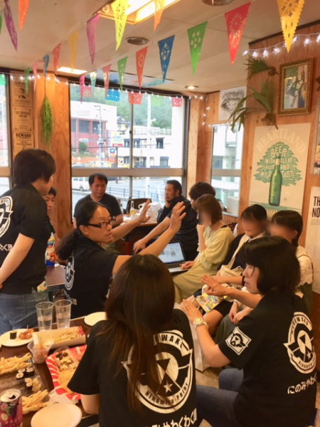 盛り上がりをみせる「にっ呑み夜会」の様子。面白いアイデアがポンポン出てきて面白くて仕方がない。ポロシャツを着ている人や着てない人もごっちゃですが、着ている人は、わくわく団の会員です。