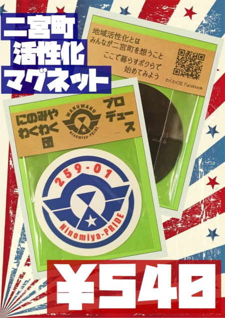 私たちの活動は行政に頼らずに行っていますので、予算がありません。活動資金が必要ですので、わくわく団ブランドの商品を開発・販売しています。現在、二宮町の町章をベースにデザインしたNinomiya-PRIDEのマグネットを二宮町民センター内、にの屋で販売しています。